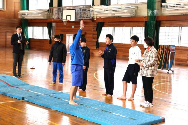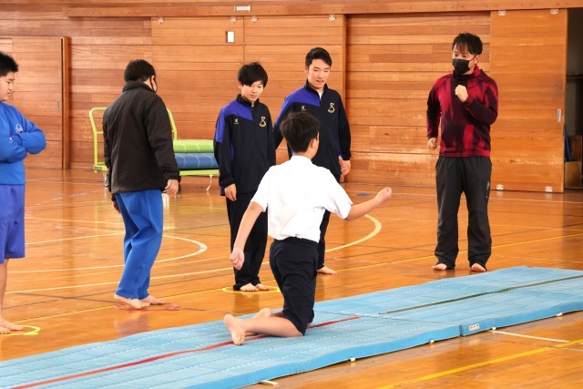 ラジオ体操から始まり、ランニング、感覚をつくる運動を行い、マット運動に入りました。感覚をつくる運動では、片足バランスや膝歩きなどを楽しみながらも一生懸命に行いました。マット運動に入ると、2つのグループで互いの演技に助言をしながら前転、開脚前転の練習をしました。