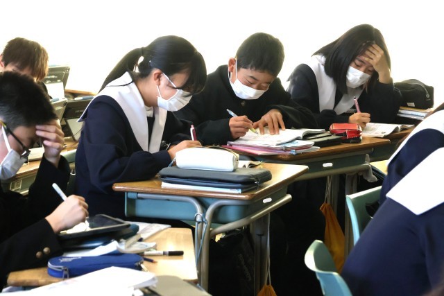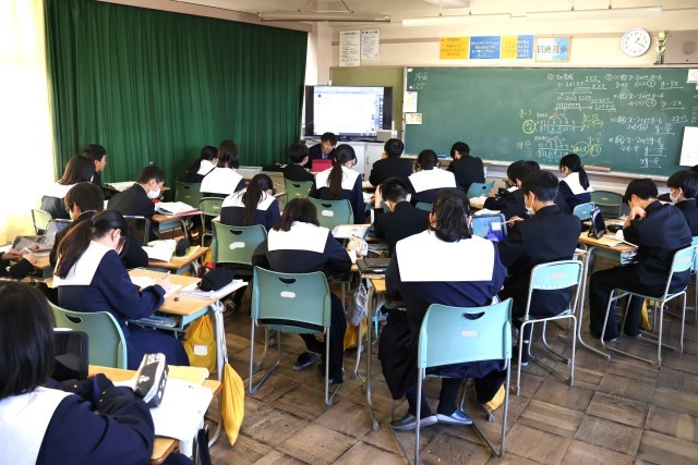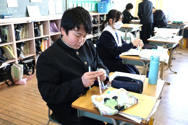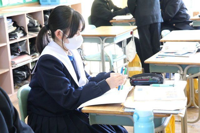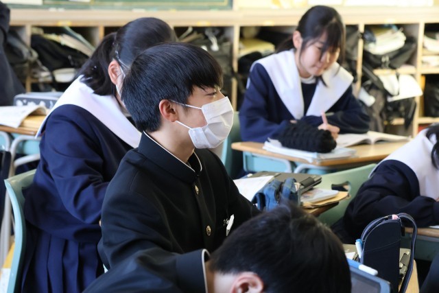 1年生の数学では空間図形を学習しています。ある学級では、空間図形の特徴を捉えるために鉛筆やペンを使い、手を動かしながら学習していました。また、別の学級では練習問題を行うのに、タブレット上で空間図形を回転させながら考えていました。それぞれのよさを感じながら方法を自分で選択できる、そんな力を身に付けられるようにすることの大切さを感じたひとときでした。