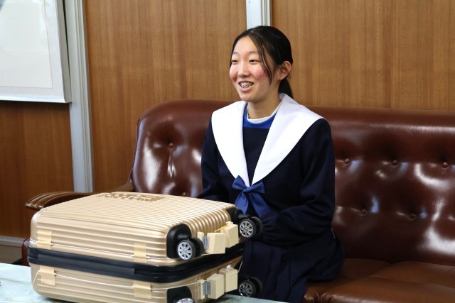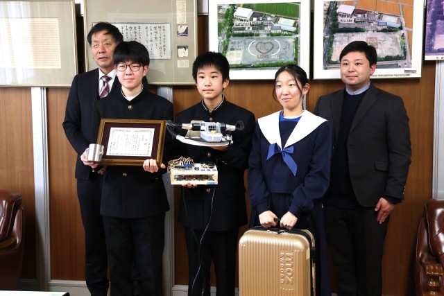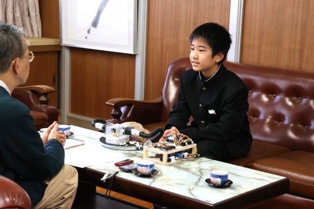 校長先生と担当の理科教諭、その後に個人賞を受賞した生徒への取材がありました。生徒への取材では、製作の動機や工夫したところ、苦労話などについての質問があり、3名の生徒はそれぞれの考えを堂々と伝えてくれました。「〇〇するにはどうしたらいいんだろう?」と問題意識をもち、試行錯誤しながら製作に取り組む姿勢が立派です。こうした取り組みが来年度さらに広がってほしいと願っています。