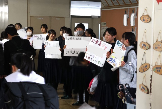 令和7年度の学年末に向けて、様々な取り組みが進んでいます。そんな中にあって、さらに令和8年度に向けての取り組みも始まっています。令和8年度前期生徒会役員・委員長選挙の立候補者が発表され、立候補者は選挙運動として、毎朝昇降口で自身の名前や公約などを登校してくる生徒に伝えています。どの立候補者もやる気満々です。篠中の昇降口は、朝から元気です!