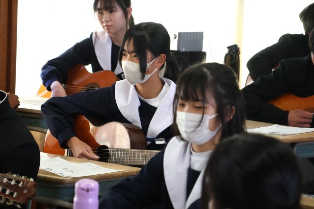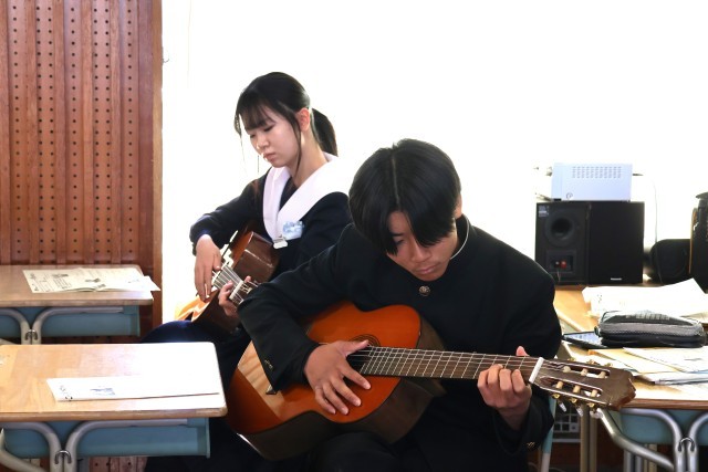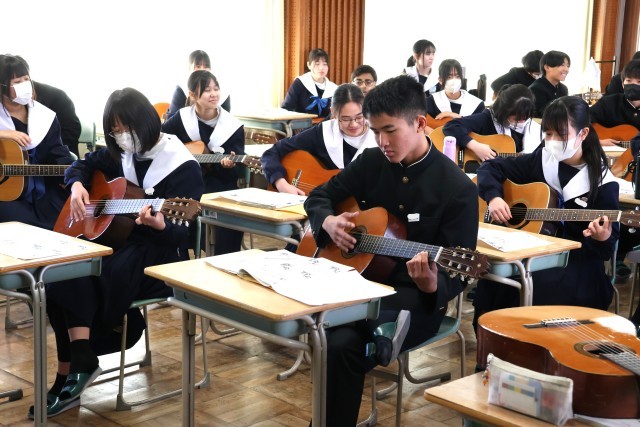 本日の3時間目、1・2年生の授業の様子を見て回っていると、4階からギターの軽やかな音色が聞こえてきました。2年生の生徒が音楽の授業でギターを弾いていました。少し話を聞いてみると、初めて触れたという生徒も多かったです。そういった中であっても、級友と助け合って練習し、「カントリーロード」を1曲演奏できるようになったというのは、生徒にとって確かな自信につながると感じました。ぜひ、揃って演奏しているのを聞いてみたい、そう思った午前中のひとときでした。